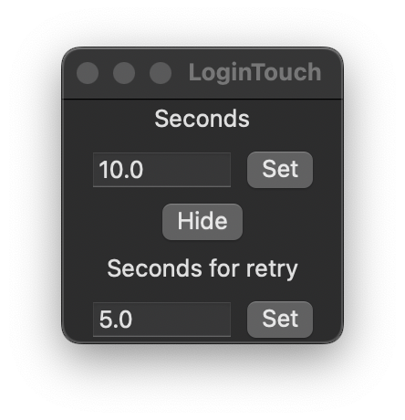 * Two factor Mac login. * Fingerprint verification after password login. 20220331: * Retry seconds configurable. * Dock icon hidden. * Top menu added.