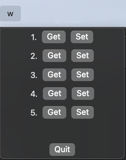 Manage split windows with ease. No more virtual desktop hassle. Switch between window pairs by clicking get. Clicking set saves the top two windows. Five pairs available for now. Contact whowideweb@gmail.com for feature requests and bug fixes.